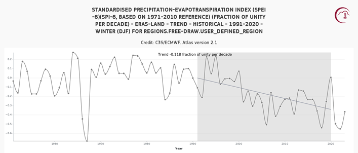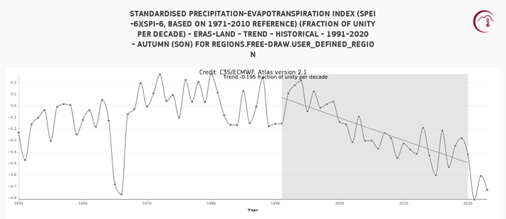 روند شدت خشکسالی بر روی خاورمیانه طی دوره 1402 -1330 شمسی را برای فصول پاییز، زمستان و سالانه مشاهده می کنید. طبق نمودار می توان گفت که از اواخر دهه 60 شمسی (90 میلادی) روند شاخص منفی شده است که بیانگر ورود تدریجی به دوره کم بارشی و خشکسالی در منطقه مورد مطالعه ما می باشد.