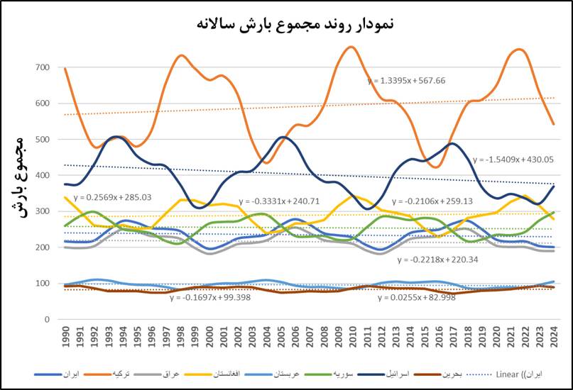 در اینجا با استفاده از داده های بارش مجموعه پایگاه اقلیمی میان مقیاس اروپا ecmwf روند بارش کشورهای خاورمیانه طی دوره آماری 1990 تا 2024 برابر با 1369 تا 1403 ترسیم گردید. همانطور که دیده می شود نوسان و تغییرات افزایشی و کاهشی مجموع باراندگی طی دوره مورد بررسی جز رفتار مسلم بارش کشورهای مورد اشاره بوده است. اما در مجموع روند آن از اواخر دهه 1990 (1376 به بعد) کاهشی شده است که دلایل و ریشه های این کاهش را بیشتر باید در فعالیت های انسانی و تخریب محیط و به تبع آن تغییرات اقلیمی جستجو کرد. نمونه آن را می توان در وضعیت آبی دریاچه ارومیه مشاهده نمود. طبق نمودار روند بارش بیشتر کشورها از جمله ایران، عراق، عربستان و فلسطین اشغالی طی چند سال اخیر کاهشی بوده و نمی توان گفت که تنها کشور ما دچار این بحران کاهش بارندگی شده است. اما نکته مهم در این است در کنار این تغییرات اقلیمی، انسان ها با دخالت های بیجا در محیط طبیعی؛ شدت خشکسالی ها و مصرف منابع آب های زیرزمینی و سطحی را تشدید کرده اند.